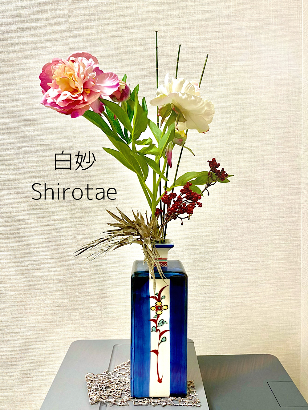 白い芍薬の気高い花姿と、冬の寒気を思わせるトクサの直線が、張り詰めた冬の空気を表現します。