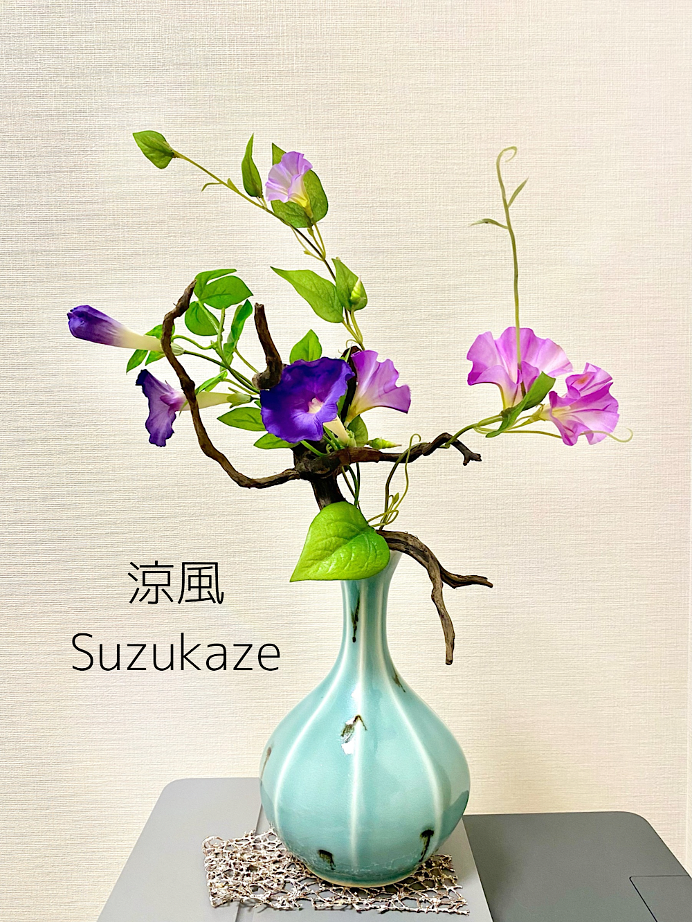 伸びやかな蔓の曲線と流木の力強さを組み合わせ、夏の生命力を感じさせながらも、ひとすじの涼しい風が吹き抜けるような清涼感を宿しています。