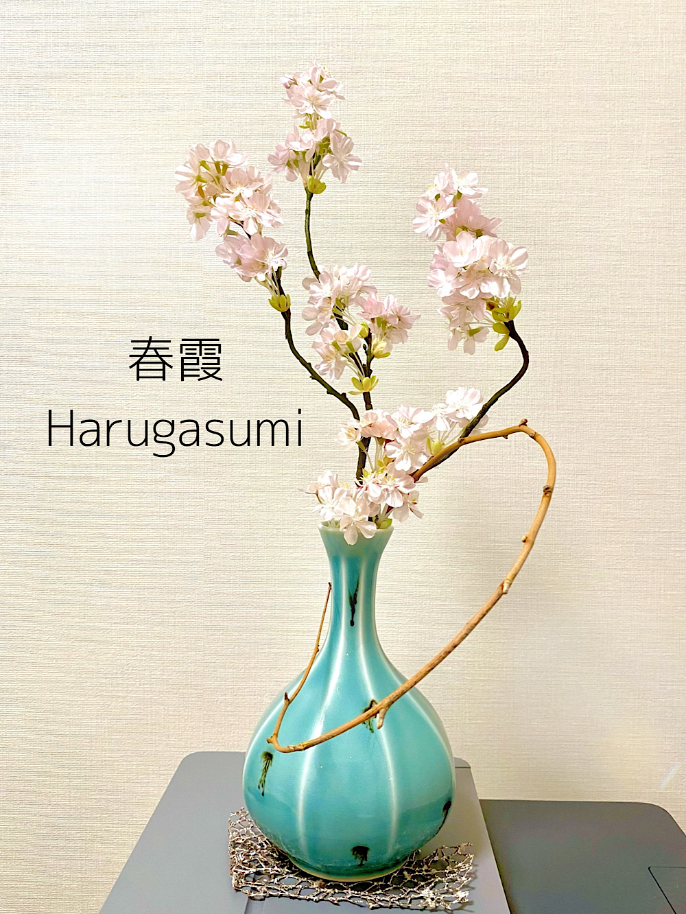 薄桃色の花弁は、まるで春の大気を透かして見えるかのように軽やかで、淡い青磁の花器と調和し、空気に溶け込むような透明感を演出します。