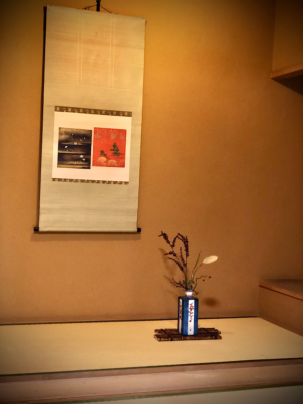 花材は桜と自然の枝。シンプルな構成の中に「余白の美」が宿り、床の間に掛かる掛け軸と呼応して、まるで時間までゆるやかにほどけていくような空気を漂わせます。